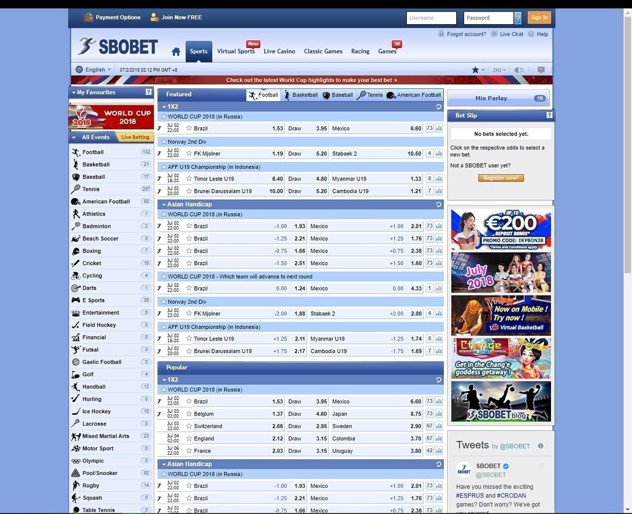 Sbobet cung cấp nhiều sự kiện thể thao đa dạng để bạn đặt cược. Trang có một sportsbook thiêng về cá cược châu Á, trọng tâm của họ là bóng đá. Tuy nhiên bạn sẽ có thể tìm thấy tất cả các môn thể thao cùng các giải đấu lớn khác từ bóng rổ, quần vợt, khúc côn cầu trên băng, cho đến bóng bầu dục, đua ngựa hoặc đua chó xám.